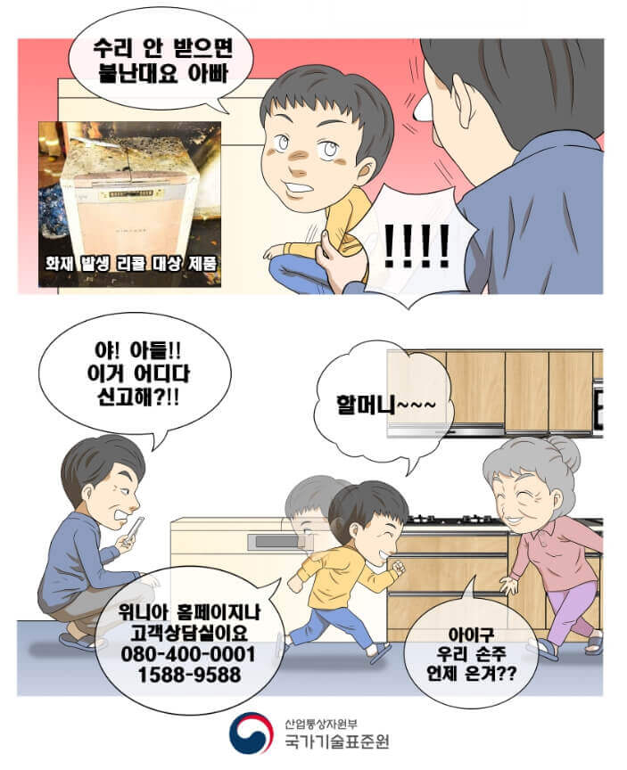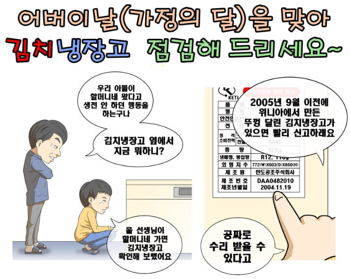 따라서 위니아와 정부가 발벗고 나서서 3년째 리콜 및 무상점검을 대대적으로 홍보하고 있는 상황입니다. 각 소방소에서도 관련 캠페인을 벌이고 있는 가운데, 최근에는 5월 가정의 달에 맞춰 국가기술표준원에서도 자녀들을 대상으로 부모님 댁에 있는 노후된 김치냉장고를 점검하자는 캠페인까지 벌여 눈길을 모았습니다.