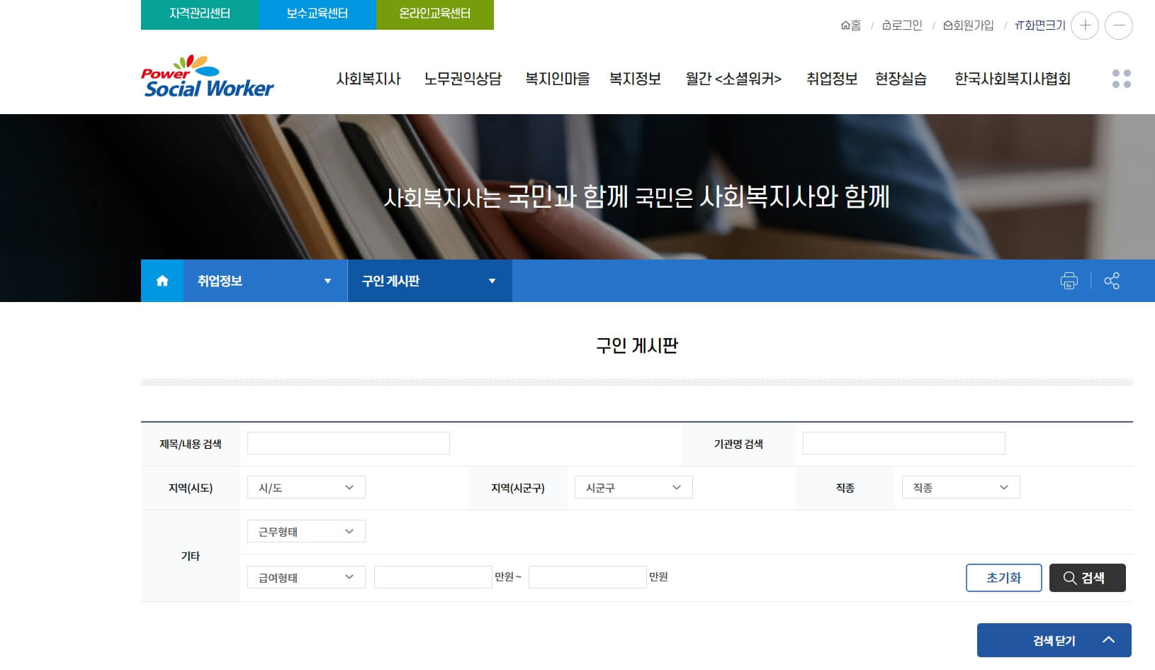 이외에도 정말 다양한 취업처가 있는데 얼마나 다양한 취업처가 있는지 직접 눈으로 확인할 수 있는 방법이 있습니다. 한국사회복지사협회 홈페이지에 들어가서 관련 구인 게시판을 보면 다양한 직종에서 사회복지사를 찾는 안내문을 확인할 수 있습니다.